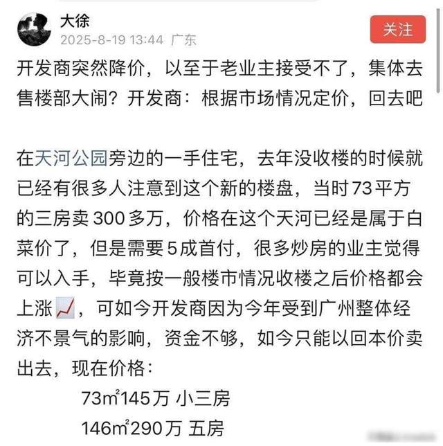 中山有个楼盘金投策略,九月底清盘,房价从一万八跌到七千,一百平的房子,总价少了一百多万,广州天河那边也有小区,挂牌价从三百万直接降到一百六十八万,开发商说,这个价卖,已经不亏了,就算旁边有清华附中,也没人买。